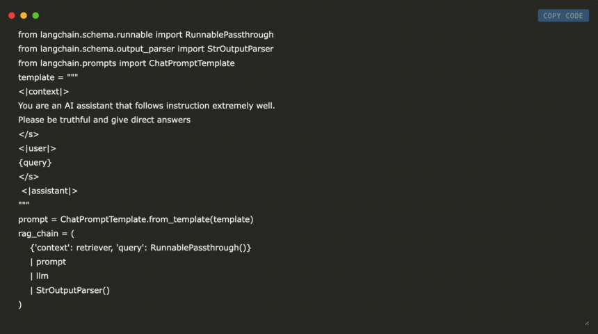 Naudodami aukščiau pateiktą, mes nustatėme RAG vamzdyną naudodami „Langchain“ karkasą. Tai sukuria pasirinktinį raginimą su instrukcijomis ir vietos žymekliais, apima konteksto retriverį ir pasitelkia kalbos modelį atsakymams generuoti. Srautas yra apibrėžiamas kaip operacijų serija („RunnablePassthrough“ tiesioginio užklausų tvarkymui, „ChatPromptemplate“, skirta greitam konstrukcijai, LLM, skirtas reaguoti į reagavimą, ir galiausiai „StroutputParser“, kad gautų švarią teksto eilutę).
